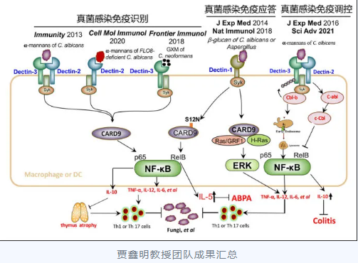 贾鑫明教授率领团队围绕“真菌感染与免疫”(成果汇总见下图),系统研究了C型凝集素受体形成同源或异源二聚体识别真菌的多样性机制,阐明C型凝集素受体下游关键接头蛋白CARD9先天性变异导致真菌病发生的新机制,发现真菌病人先天性免疫缺陷新的免疫检查点,揭示E3泛素链接酶Cbl-b和c-CBL负调控C型凝集素受体介导抗真菌免疫的新机制,奠定以C型凝集素受体通路为靶点研发免疫治疗新策略的理论基础。
