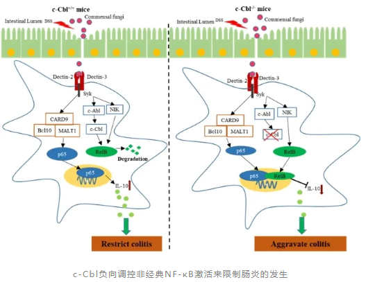 综上所述,该研究发现DC特异性敲除c-Cbl致使小鼠更加易感DSS诱导的结肠炎,且与肠道共生真菌紊乱相关。同时,该研究进一步解析了相应的作用机制,即c-Cbl与RelB的相互作用,介导RelB 泛素化,进而调控真菌多糖α-mannan介导非经典NF-κB通路的活化。最后,该研究还发现,c-Abl可协同α-mannan来激活c-Cbl,最终调控c-Cbl的功能。总之,该研究不仅揭示了c-Cbl在先天免疫细胞中的功能,同时也表明c-Abl-c-Cbl轴可成为开发治疗IBD药物的新靶点。