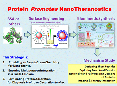 近五年多来,张兵波课题小组紧紧围绕以减少和消除纳米探针非特异性吸附现象为目标,尝试采用生物体内高丰度蛋白,利用其独特的结构域和氨基酸序列,先后开展了纳米颗粒表面蛋白工程化修饰(Surface Engineering,代表成果为Langmuir 2012, 28, 16605; ACS applied materials & interfaces, 2012, 4,6479;Nano Research 2014, 7, 1581; Biomaterials 2015, 48, 16; Journal of Materials Chemistry B 2016, 4, 4110;Langmuir 2016, 32, 1155)、蛋白介导生物模拟仿生合成纳米探针(Biomimetic Synthesis,代表成果为Journal of Materials Chemistry 2012, 22, 14494;Journal of Colloid and Interface Science, 2012, 372, 239 ;ACS applied materials & interfaces 2016, 8 ,16612;ACS Nano 2016, 10, 10245)和相关机制及其扩展研究(Journal of Materials Chemistry B 2016, DOI: 10.1039/C6TB02308H,被选为back cover;Acta Chim Sinica 2014, 72, 1209;Advanced Healthcare Materials 2016, DOI: 10.1002/adhm.201600865)等一系列的研究。