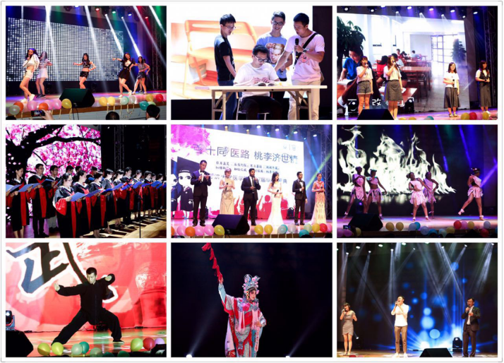 中午十二点半,在129礼堂,文艺汇演在充满同学们点滴回忆的视频中拉开序幕。热辣的舞蹈将气氛点燃,平实的短剧勾起医学生的点滴回忆,充满中国风韵味的京剧和武术让来自世界各地的毕业生和他们的家人感受中国的神奇魅力,MBBS的学生热情的舞蹈带来非洲风情,温馨甜蜜的歌曲串烧在院长登台同唱中达到高潮,毕业生在微信墙上自由地表达着毕业祝愿和感动。