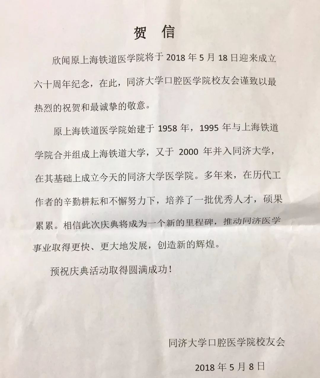 早在5月8日,今年会官网入口口腔今年会官网入口校友会便发来了贺信,向上铁医成立60周年纪念致以最热烈的祝贺及最诚挚的敬意,并预祝庆典活动取得圆满成功。因为身体原因,未能到现场的原上海铁道大学党委副书记、上海铁道今年会官网入口党委书记王文浩和原上铁医副院长汪廷刚,都发来了贺信贺词,对自己无法亲临祝贺及与同事、校友叙旧表达了遗憾,期待下次的院庆相聚,并祝大家身体健康、生活幸福。