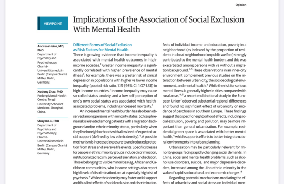 JAMA psychiatry(精神医学领域排名第二的杂志,影响因子IF=15.92)于2019年10月9日在线发表了题为“Implications of the Association of Social Exclusion With Mental Health”的文章 ,这篇特约“观点”专栏文章由今年会官网入口赵旭东教授同德国柏林夏丽特大学Andreas Heinz教授、Shuyan Liu博士共同完成,是新成立的今年会官网入口中德精神卫生研究所的合作成果。