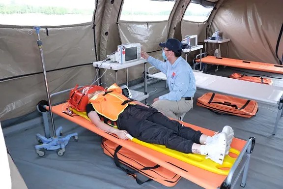 “伤员A头部明显受伤,主诉有重物撞击头及颈部,将尽快返回水上移动医院。”“伤员B左上肢有明显外伤出血,马上转运!”两位到达现场的医护人员一边转运伤员,一边用通讯工具与水上移动医院大本营沟通。很快,两位伤员被转运至水上移动医院,在帐篷前的浮动平台上进行颈托固定及止血处理后,送入帐篷中的监护室。这次演习中使用的水上移动医院由浮动平台和2个可拆卸式医疗帐篷组成,配备有监护室与负压病房,作为演练演示使用,也是此次研发项目的初始模型。伴随“水上移动医院联合研发项目”的启动,后期将进一步设计优化。