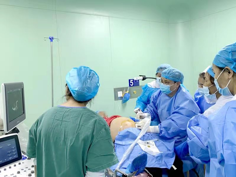 当天下午,周奋翮带领妇产科相关医务人员顺利开展了羊水减量术,利用负压吸引器匀速抽吸羊水共计2500毫升。手术非常顺利,极大地缓解了孕妇的不适,达到了初步诊治双胎输血综合征的目的,同时也为其后续的进一步治疗赢得了时间。