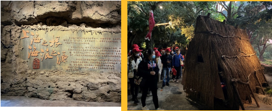 通过观看各种各样的遗址模型和出土文物,同学们对上海文化的来源和底蕴有了更加深刻的认知。行至此处,大家的目光突然被此碑吸引,经导游讲解,终于领会了上海称“沪”之内涵——原来“沪”是渔民捕鱼的一种工具,列竹于海澨称“沪”;“渎”指独流入海的河口。在通海河口列竹捕鱼即为“沪渎”。后来上海兴起于此,故有“沪”之简称。