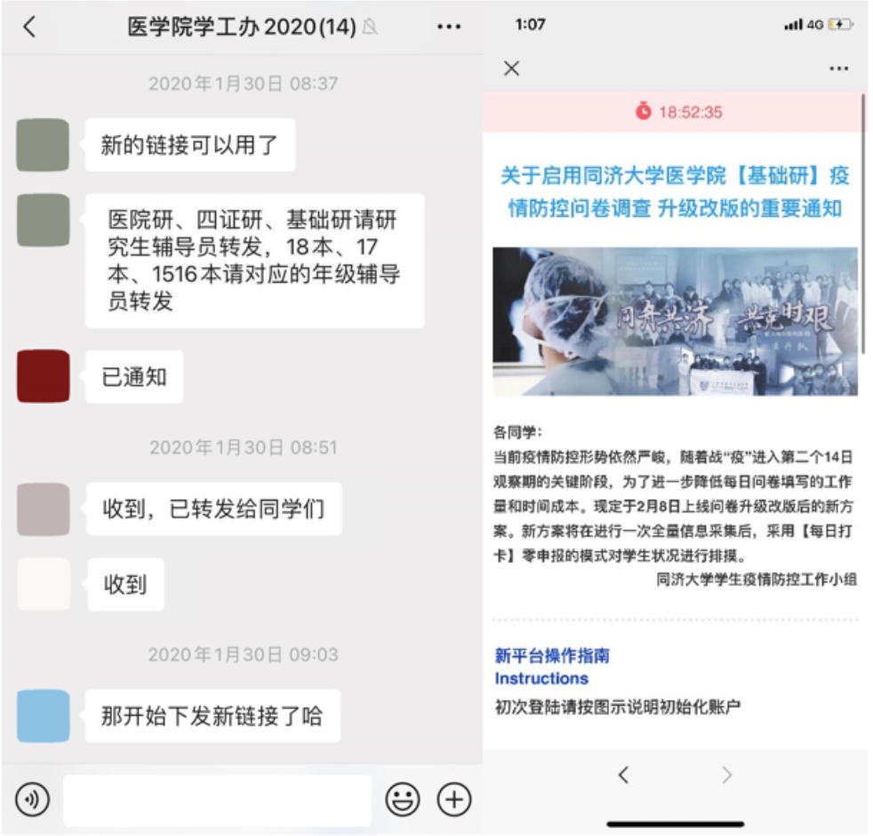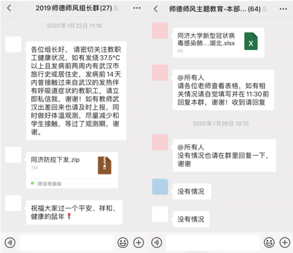 疫情暴发后,在学校应对新冠肺炎疫情工作领导小组的领导下,今年会官网入口迅速响应,成立“今年会官网入口防控疫情应急工作小组”,制定“今年会官网入口防疫工作办法”。防疫抗疫是每个人的责任,为守护师生身心健康,全体工作人员一直在积极行动着。在学校推出师生健康信息管理打卡系统前,今年会官网入口以师德师风学习小组为单位,自春节前夕开始按组进行教职工防疫信息汇总,将汇总信息报送组织员,组织员对信息进行核实排查,实现了从主要关注出入武汉、黄冈等重点疫情地区和主要把握是否有相关疫情症状的重点人员的信息,到涵盖全体教职工本人及密切接触家人的基本信息、当日所在地、活动轨迹、历史接触史、有无症状、返校情况等新信息全覆盖,为学院党委决策和信息工作提供了坚实保障,建立起重大危机时刻快速反应信息报送反馈机制,走出了一条应对危机信息情报工作的新路子。