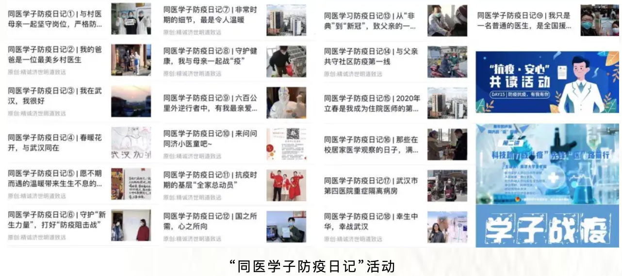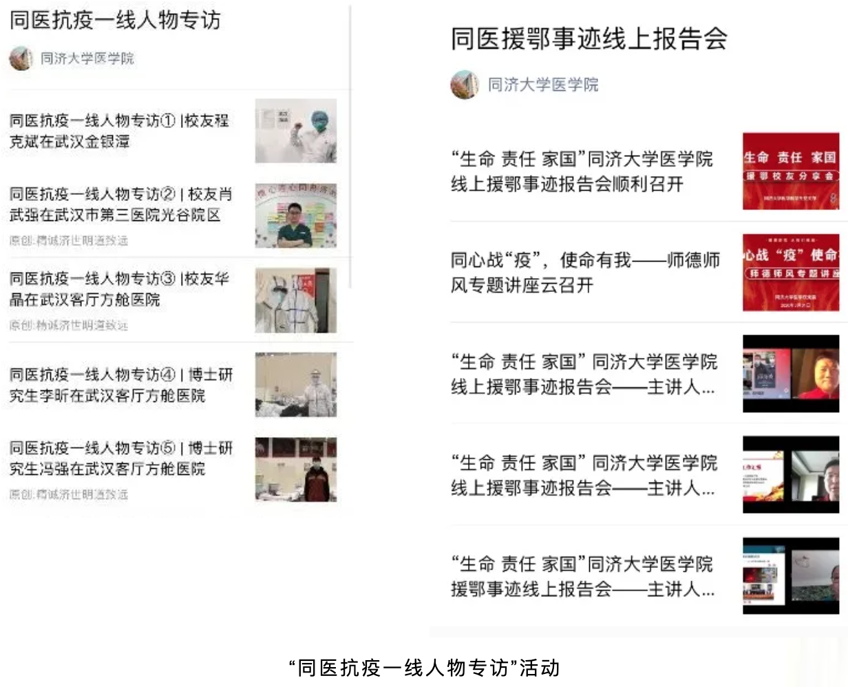采访抗疫一线党员校友,高度凝练校友故事背后的精神内涵,图文并茂进行生动展示,形成“同医抗疫一线人物专访”系列推送。邀请援鄂医护人员做“同医援鄂事迹线上报告会”,通过分享互动呈现一线医护人员的工作生活图景,展现“但有所命,无有不从”的党性修养,以榜样力量牢筑思想根基。