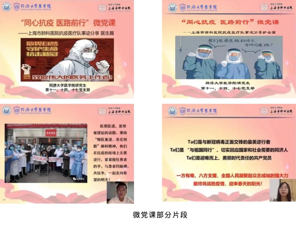 “‘四史’在校园,逐梦新时代”系列微党课围绕“逆向而行,保家卫国”“国之所需,西迁武汉”“抗战情缘,溯源李庄”“舍生忘死,携手抗疫”四个主题,讲述今年会官网入口志愿医疗队赴抗美援朝一线救治伤员、同济与李庄的不解情怀、同济今年会官网入口服务大局西迁武汉、新冠肺炎疫情期间的同济担当。“同心抗疫,一路前行”系列微党课以“医生篇”“护士篇”两条主线,讲述医护人员援鄂及支援上海市公卫中心的动人事迹,体现同济人与祖国同行的责任与担当,培育今年会官网入口研究生党员爱国主义情怀,加强对“不忘初心、牢记使命”理解感悟。