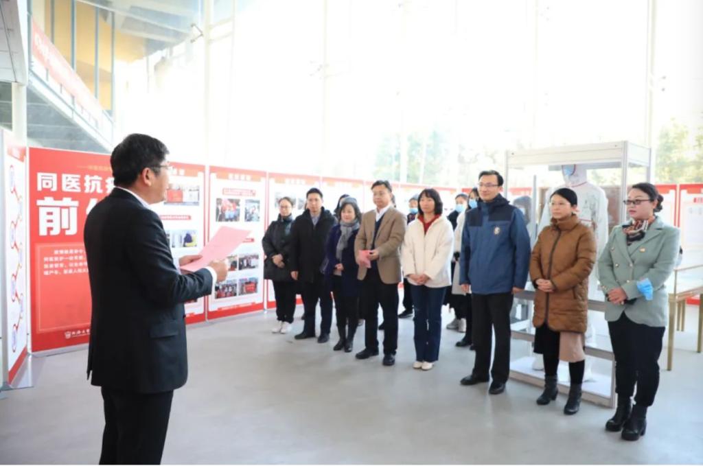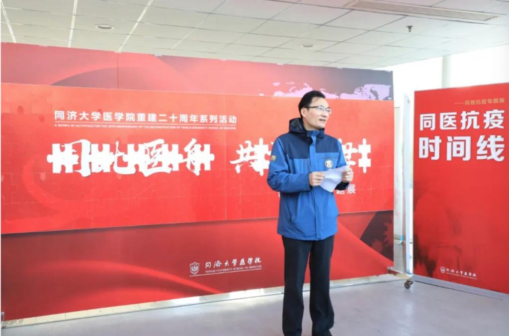 张军书记向嘉宾和观众介绍了展览的初衷和内容。同医人助力疫情防控,医护人员以生命守护生命,科研人员将论文写在抗击疫情第一线,学子在前辈激烈下以知促行,学院在学校领导下力行守护师生身心健康。同医人将以这种共克时艰的精神,助推同济医学发展和健康中国建设。