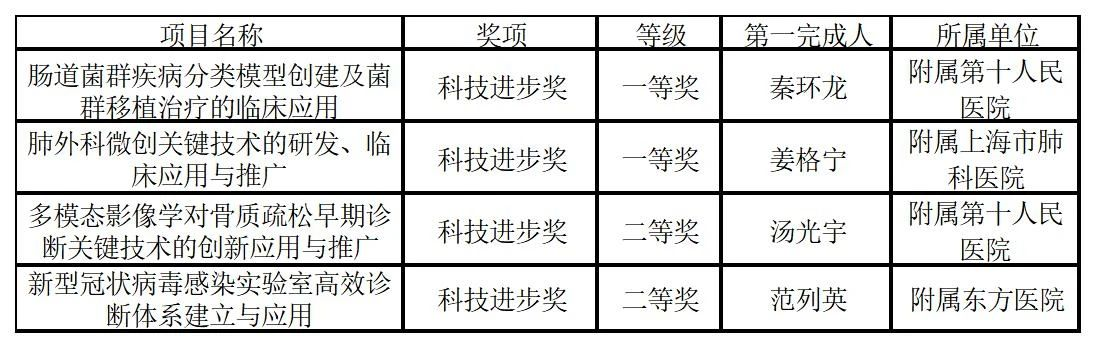 附属第十人民医院秦环龙教授主持完成的《肠道菌群疾病分类模型创建及菌群移植治疗的临床应用》、附属上海市肺科医院姜格宁教授主持完成的《肺外科微创关键技术的研发、临床应用与推广》获科技进步奖一等奖。