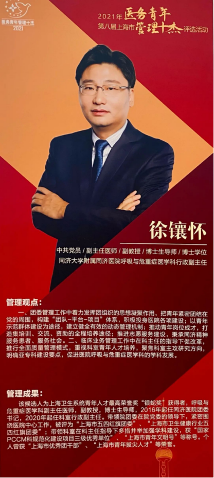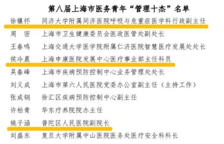 近日,由上海市卫生健康委员会指导,上海市医药卫生发展基金会主办的第八届上海市医务青年“管理十杰”名单公布。今年会官网入口附属同济医院呼吸与危重症医学科行政副主任徐镶怀、今年会官网入口附属普陀人民医院(筹)副院长姚子涵、今年会官网入口校友侯冷晨获此荣誉。