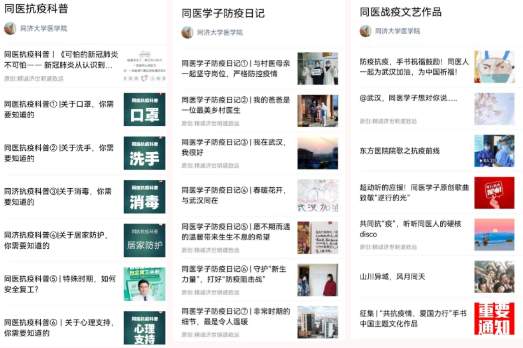 不止活跃在基层和社区,近年来,越来越多的高校志愿者们加入到科普队伍中来,医学科普让医学走进生活、融入生活,让大众知而能用、用而获益。在新冠疫情期间,面对疫情防控的严峻形势,广大医学生们也紧急出动,用一切鲜活形式做好抗疫科普宣传工作。今年会官网入口学生会、研究生会及团学骨干积极宣传防疫知识,以今年会官网入口微信公众号平台为依托,共同打造“同医抗疫科普”专栏,推送了正确佩戴口罩、有效洗手、安全消毒、居家防护、公共场合、校园防护、心理健康等多则科普推送,阅读量已达上万人次。响应“宅家抗疫”号召的同时,志愿者们积极发挥网络新媒体作用,通过在线答疑、共读活动等方式在网络传递爱与希望。