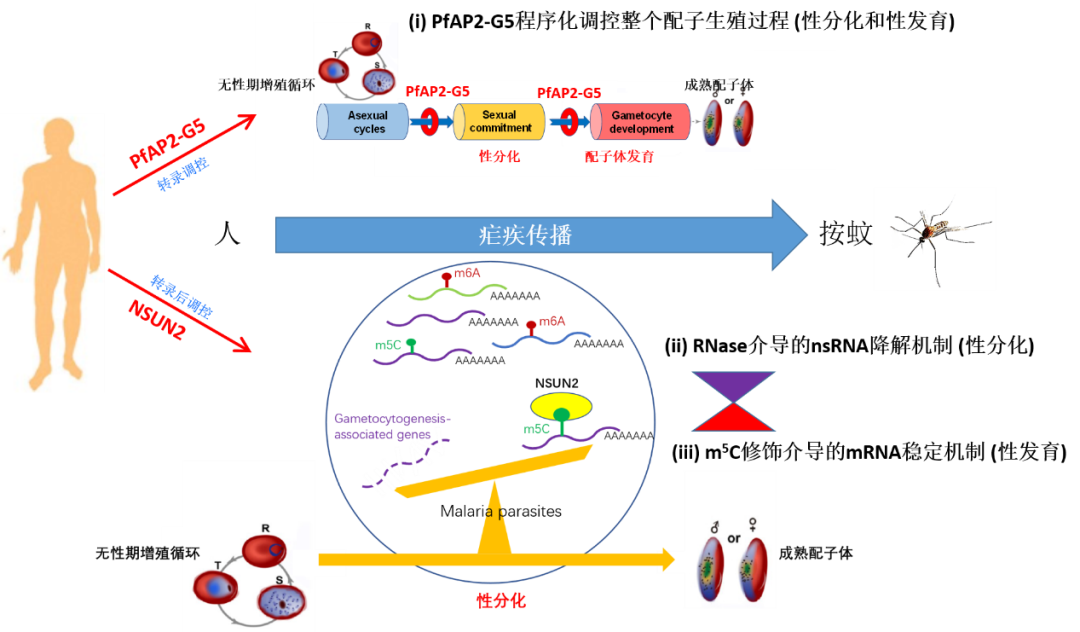 疟疾(malaria)是由疟原虫感染引起的寄生虫病,与艾滋病、结核病并列全球三大传染病之一,全球有近90个国家和地区存在疟疾流行,每年约2.4亿人感染,导致约60多万人死亡。我国虽然实现了消除疟疾目标,但目前仍有大量境外输入病例,如何防止输入再传播是巩固我国消除疟疾成果的关键。疟原虫的生活史需要经历人和按蚊两个宿主,只有成熟的配子体才能通过按蚊传播。因此,疟原虫的配子生殖过程,即在人体内红细胞寄生阶段的无性体(asexual forms)向配子体(gametocytes)的性分化和发育(sexual commitment and development),是疟原虫感染按蚊的关键,也是疟疾传播的决定性环节。在之前的研究中,张青锋课题组已从转录水平和转录后水平分别揭示了两条调控疟原虫配子生殖的表观遗传调控途径:(i) 转录抑制因子AP2-G5与转录激活AP2-G协同调控整个配子生殖过程,包括性分化与性发育,直至成熟配子体的产生;(ii) RNA降解酶(Exosome-associated RNases)如RNase II和Rrp6等通过实时降解靶基因的新生RNA(nsRNA),调控配子生殖过程的启动(性分化)。但是,对于表观转录组是否参与调控疟原虫配子生殖,目前尚不清楚。