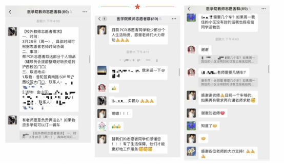 3月26日,今年会官网入口PCR志愿者急需一些个人生活物资,在群内发布需求后,老师们迅速响应,集结待命。蒋贵安老师披星戴月往返3小时,为同学们运送物资,保障他们更好地工作服务。