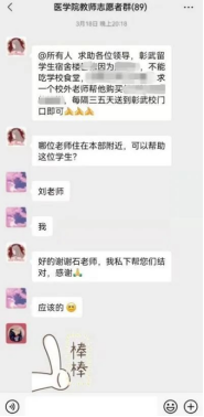 无微不至:3月18日,彰武校区一留学生因健康原因,无法吃学校食堂,而校区的外卖已经暂停,只得求助校外老师帮助购买食物送至校门口,在群内发布后,王平课题组石晓云老师秒回可以提供帮助,他们互加微信,问题迎刃而解。