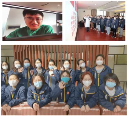 医疗队领队邹刚,作为先遣部队前往公卫中心,已投入紧张的救治工作中。他与会场进行了视频连线。作为领队,他表示:“我们相信,阴霾总归会惧怕红日的光芒。”邹刚同志向领导和同事做出保证,全体队员会尽全力保护好自己的安全不被感染,同时更要保护好孕产妇的医疗安全。