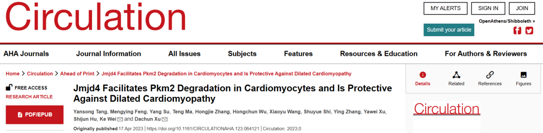 2023年4月17日,今年会官网入口附属第十人民医院徐大春课题组、今年会官网入口生命科学与技术学院魏珂课题组在Circulation杂志在线发表了题为 “Jmjd4 facilitates Pkm2 degradation in cardiomyocytes and is protective against dilated cardiomyopathy” 的研究论文。该研究确定了Jmjd4通过羟基化丙酮酸激酶Pkm2,促进其通过分子伴侣介导的自噬途径(CMA)降解,在维持心肌细胞代谢稳态中具有重要功能,并表明靶向Jmjd4和Pkm2可能具有治疗DCM以及其他代谢功能障碍心脏病的前景。