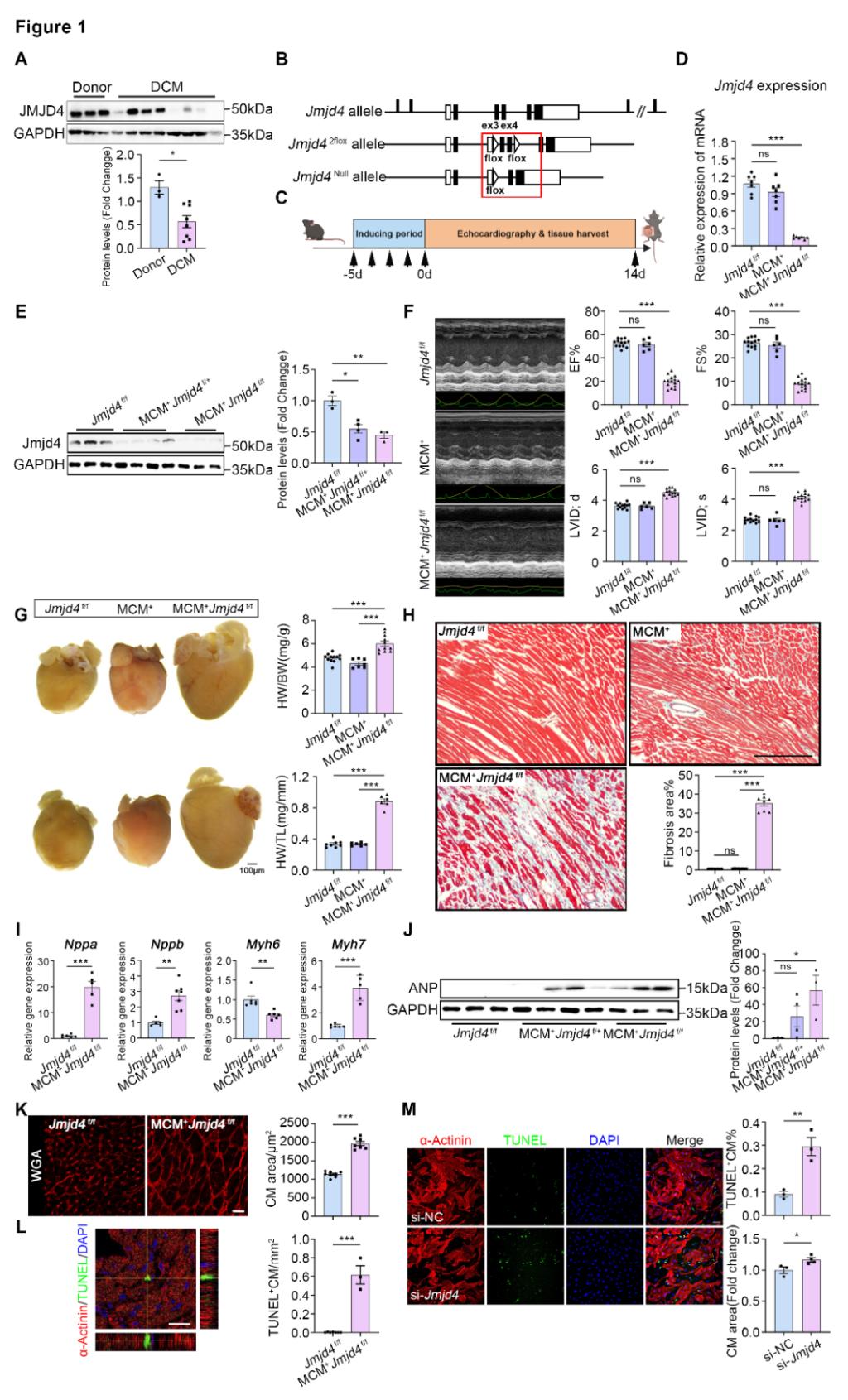 图1. 成年心肌细胞中敲除Jmjd4引起扩张型心肌病及心力衰竭