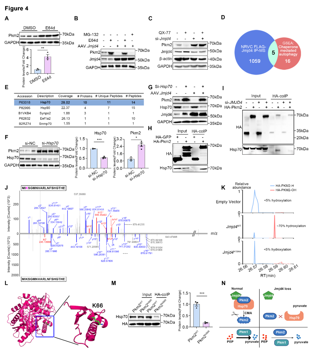 为了进一步阐述Jmjd4调控Pkm2降解的机制,研究者通过质谱技术确定了Pkm2的特异性羟基化修饰位点(K66),并通过实验证明该位点的突变体K66R不能结合降解过程的核心分子Hsp70,表明在心肌细胞中,Jmjd4对Pkm2的羟基化修饰对其蛋白稳定性是十分必要的(图3)。