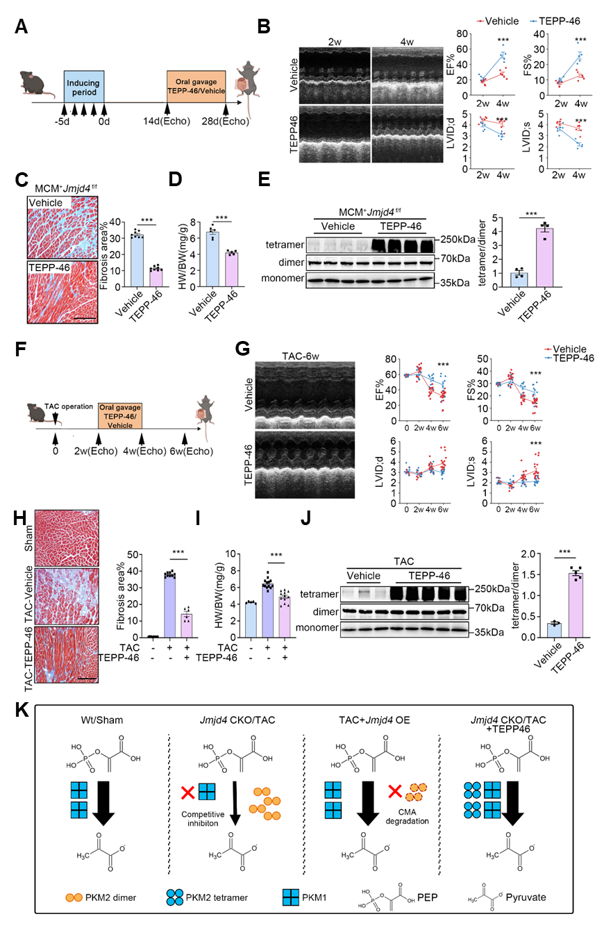 最后,为解除积累的低酶活Pkm2对心肌细胞代谢的阻滞,研究者使用Pkm2变构激动剂TEPP-46成功治疗挽救了Jmjd4条件性敲除小鼠的扩心病表型,该小分子在压力负荷诱导的小鼠心衰模型中同样发挥了不错的治疗作用,表明Pkm2很可能是心脏代谢干预治疗的普适性靶点(图4)。