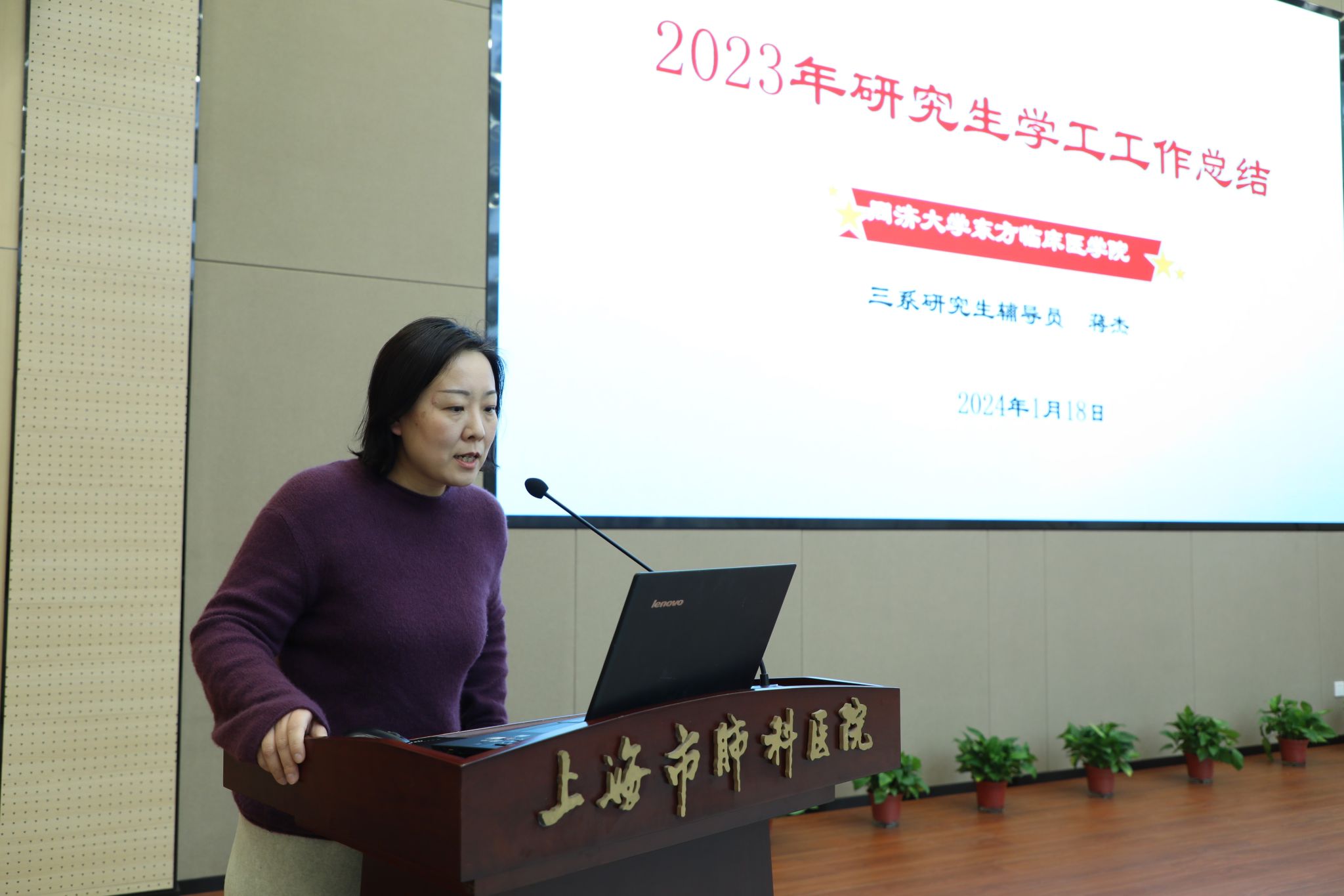 系部述职环节分别由附属第十人民医院本科生负责人杨佳敏、附属第十人民医院研究生负责人王园园、附属同济医院学生工作负责人黄蕾、附属同济医院学生工作负责人徐笑男、附属东方医院本科生负责人肖蕾、附属东方医院研究生负责人蒋杰、附属上海市肺科医院学生工作负责人沈瓅、附属妇产科医院学生工作负责人成星、附属杨浦医院本科生负责人张文杰、附属杨浦医院研究生负责人张小丽、附属养志康复医院本科生负责人邵俊杰、附属养志康复医院研究生负责人范辰辉、附属皮肤病医院学生负责人谭飞和附属上海市第四人民医院学生负责人冯蕾等14位老师围绕思政引领、日常管理、班团建设、特色工作等方面展开汇报。大家反思了困难点、总结了新做法、凝练了好经验、展示了新亮点,并对2024年工作进行了展望。