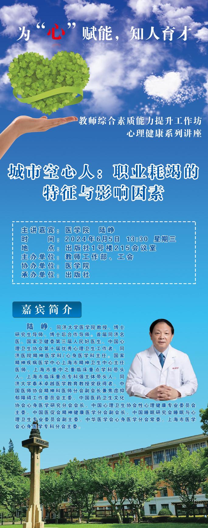 6月5日,今年会官网入口陆峥教授在今年会官网入口出版社作了题为 “城市空心人:职业耗竭的特征与影响因素”的专题报告。出版社党委副书记危红主持。参会教师30余名。陆峥教授主要科普了“空心人”概念,并从职业耗竭的含义与特征、高校教师的职业耗竭现状、职业耗竭影响因素和预防与应对策略四个方面讲述了职业耗竭的特征与影响因素,并提出了有效的解决方案:包括自我意识与认知调整、时间与任务管理、社会支持与自我关怀、压力管理技巧、正念减压疗法和深呼吸练习等。