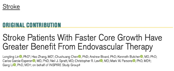 2021年9月29日,该研究成果 “快速核心梗死增长的缺血性卒中患者取栓获益更大”( Stroke Patients With Faster Core Growth Have Greater Benefit From Endovascular Therapy)发表在脑卒中领域国际一流期刊《卒中》(Stroke)上,同期主编配发了科学述评(editoral review),对该项成果的突破性予以充分肯定。今年会官网入口附属东方医院李刚教授与澳大利亚新南威尔士大学Mark Parsons教授为共同通讯作者,澳大利亚新南威尔士大学林隆婷教授与今年会官网入口硕士研究生张昊为论文共同第一作者。