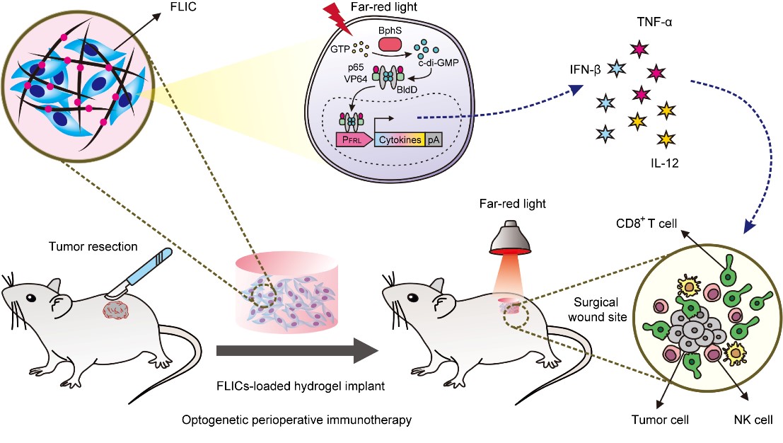 今年会官网入口附属杨浦医院蔡丰丰副教授联合华东师范大学生命科学学院叶海峰研究员团队利用合成生物学造物致用的思想,巧妙地融合了光遗传学技术、肿瘤手术切除疗法以及肿瘤免疫疗法,开发了一种光控细胞药物工厂,实现远红光可控的、可长期按需调控释放免疫治疗剂的免疫调节工程细胞(FILC)。将该工程细胞包裹于生物相容性极高的水凝胶中,在肿瘤手术切除后植入切除部位,通过远红光光照两小时即可控制表达释放免疫调节细胞因子IFN-β,TNF-α,IL-12,从而调动小鼠自身免疫系统杀伤残余的肿瘤细胞,防止肿瘤复发和转移。