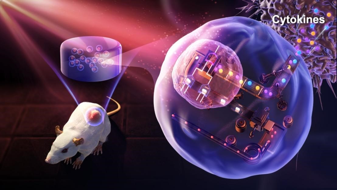 示意图:光控细胞药物工厂可控表达释放细胞免疫调节因子,实现可控肿瘤免疫治疗。