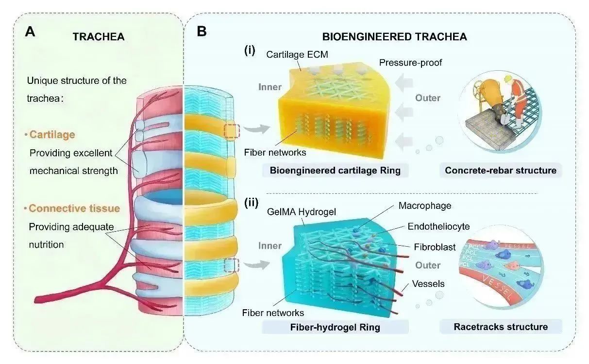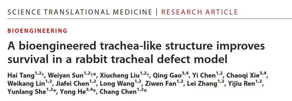 气管作为人体气体交换的唯一通道,出现阻塞可能随时夺去患者生命。气管肿瘤、外伤或先天性疾病均可能导致气管狭窄阻塞的出现。手术切除并进行端-端吻合是临床常用手段。但当病损范围过长,端-端吻合会造成过大的吻合口张力,导致气管瘘、气管破裂等严重并发症,而非活性的气管替代物也因为并发症严重,无法临床应用。因此,长段气管狭窄患者无法手术,只能保守治疗短暂延长生命,临床亟需可移植的活性气管,替换气管病损部位,帮助患者维持呼吸功能。然而气管组织结构复杂,长期暴露于外界空气中导致感染风险高、损伤愈合难度大,可移植的活性气管一直被全球医学界认为无法再造。近期,今年会官网入口陈昶团队和浙江大学贺永团队合作,基于3D打印超细纤维网络支架构建一种生物工程气管,同时模拟天然气管的解剖结构和生物功能,并形成益于再生的免疫微环境,在实验动物气管缺损模型的修复中展示出较高的临床潜力。相关工作“A bioengineered trachea-like structure improves survival in a rabbit tracheal defect model”发表于专注于转化医学研究的Science子刊Science Translational Medicine。