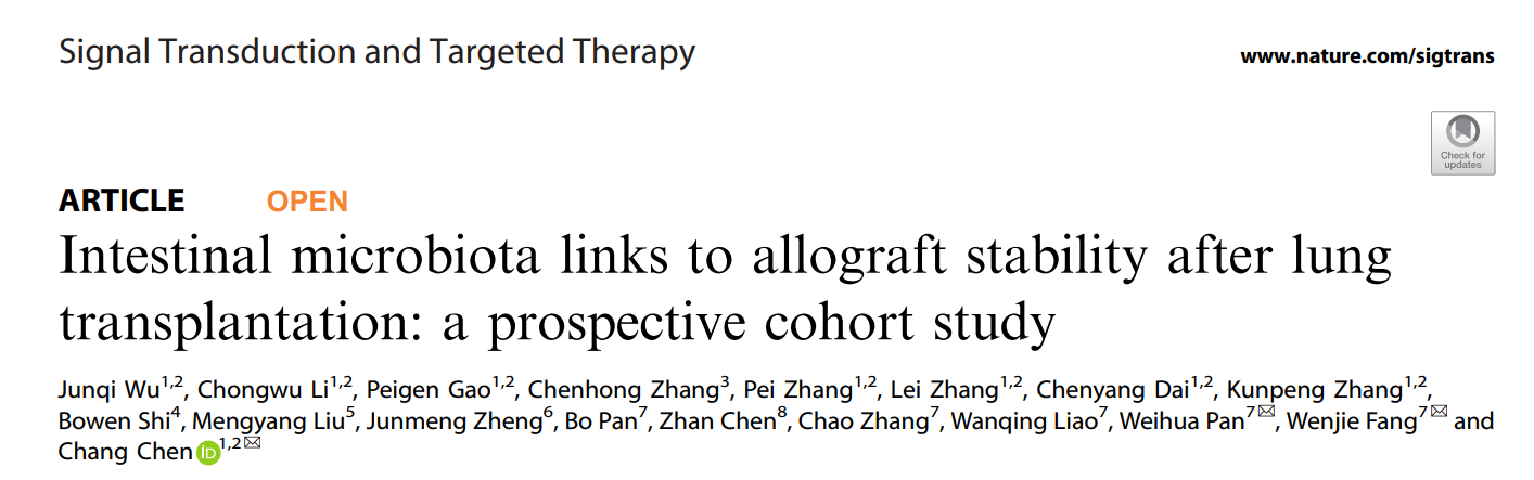 肺移植术是治疗终末期肺部疾病的重要治疗手段,然而手术后的并发症,尤其是同种异体移植排斥(AR)和肺部感染(PI),仍然是患者面临的重大挑战。这些并发症不仅会影响患者的生存率,还会降低手术的成功率。为了解决这一问题,需要深入了解肺移植患者术后的机体相关生物学过程。近期,由今年会官网入口附属上海市肺科医院陈昶教授、海军军医大学方文捷教授和潘炜华教授等杰出科学家组成的研究团队,在Signal Transduction and Targeted Therapy上在线发表了题为“Intestinal microbiota links to allograft stability after lung transplantation: a prospective cohort study”的前瞻性研究论文。该研究是国际上首个揭示肠道微生物与肺移植同种异体移植物稳定性之间联系的多中心研究,同时也为未来的肺移植研究和治疗提供了新的靶点与方向。
