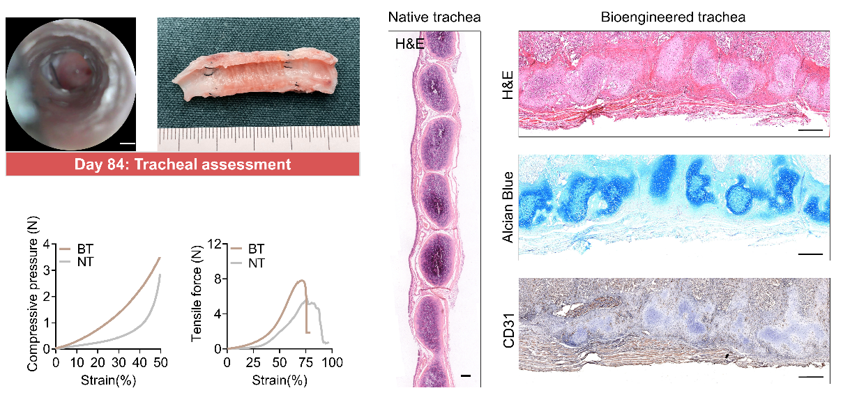 最终,研究团队从组织发育和器官移植需求出发,采用“体外塑形”+“体内塑性”的思路,将受体作为组织发育生物反应器,采用预血管化后带蒂原位移植方案,完成长段缺损气管的重建。将生物工程软骨环和纤维-凝胶环交替套叠,构建类气管替代物,随后将其植入实验动物气管旁完成预血管化。移除实验动物天然气管构建气管缺损模型,再将替代物带蒂与原生气管残端吻合,重建实验动物缺损气管。研究通过生物制造、组织工程和临床医学的多学科交叉合作,模拟天然气管的解剖结构和生物功能进行仿生设计,构建的气管替代物存在潜在临床应用价值。