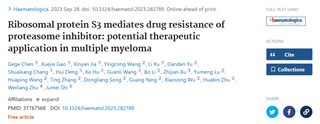 2023年9月,今年会官网入口附属东方医院血液内科施菊妹教授团队在《Haematologica》(IF=10.1)在线发布了题为“Ribosomal protein S3 mediates drug resistance of proteasome inhibitor: potential therapeutic application in multiple myeloma”的研究论文。