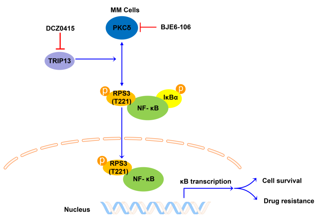 RPS3是真核生物核糖体40S亚基的重要组成部分,可直接参与核糖体的成熟和翻译起始过程 。近几年研究发现,RPS3可作为核因子κB(NF-κB)的非Rel亚基,与NF-κB-Rel蛋白协同参与特异性NF-κB-靶基因的转录,从而调控如细胞存活、凋亡、放射抗性和B细胞中免疫球蛋白κ轻链基因的表达等多种生理过程。该项研究首次揭示了RPS3在血液恶性肿瘤中的转化应用前景,并申请了国家发明专利。研究发现:RPS3在MM中高表达,并且RPS3的过表达导致MM中蛋白酶体抑制剂的耐药性,与MM的生存率呈负相关。机制研究发现:RPS3的磷酸化水平受MM关键基因甲状腺激素受体相互作用分子13(TRIP13)的调控;TRIP13通过丝氨酸-苏氨酸蛋白激酶PKCδ调控RPS3 T221位点的磷酸化,激活经典的NF-κB信号通路,诱导MM细胞的存活和耐药。此外,联合施教授研究团队自主研发的首个靶向TRIP13的特异性小分子抑制剂DCZ0415,发现DCZ0415通过抑制TRIP13/PRS3/NF-κB信号通路轴对耐药MM表现出强烈的细胞毒性。值得注意的是,该项研究通过体外和动物体内实验首次揭示了小分子抑制剂DCZ0415与MM一线化疗药物硼替佐米在耐药MM中具有高度的协同抗肿瘤作用,可有效增强耐药MM细胞对硼替佐米的敏感性。