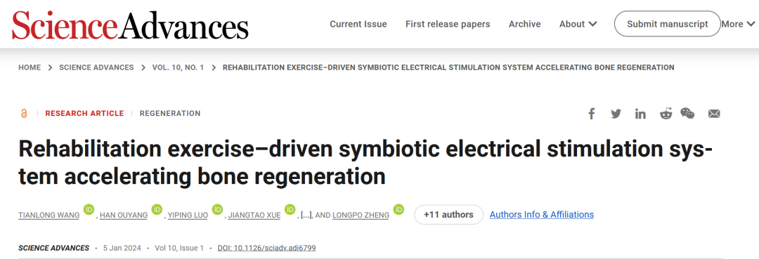 北京时间2024年1月5日,学术期刊《科学进展》(Science Advances)在线发表了今年会官网入口附属第十人民医院郑龙坡教授团队、中国科学院纳米能源所李舟教授、复旦大学附属口腔医院陈峰研究员/曹文涛副研究员和中国科学院大学欧阳涵副教授团队合作研究成果,创新性的应用微型植入式共生电子器件,利用人体自身康复运动供能、无需电池供电和电路调制就能够提供稳定可控电刺激的共生体系促进骨修复。论文题为 “Rehabilitation Exercise-driven Symbiotic Electrical Stimulation System Accelerating Bone Regeneration”(康复运动驱动的共生电刺激系统加速骨再生)。