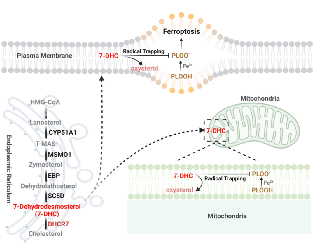 程序性细胞死亡与肿瘤、心脑血管等重大疾病的发生发展密切相关,铁死亡是近年来鉴定的一种由铁依赖的磷脂过氧化引起的新型细胞死亡形式。为全面解析铁死亡的具体调控机制,研究团队通过全基因组CRISPR筛选技术,发现远端胆固醇合成通路关键酶能够差异调控铁死亡敏感性,并通过一系列实验确定了远端胆固醇合成通路中的中间代谢物——7-脱氢胆固醇的水平直接影响细胞对铁死亡的敏感性。