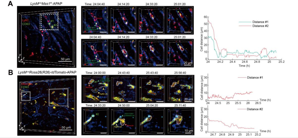 视频A截图:活体小鼠肝脏中观测到CD63+内皮细胞与Ly6C+单核细胞之间存在持续互作;视频B截图:DAOSLIMIT观测活体小鼠肝内由内皮细胞亚群,库普弗细胞和单核细胞组成的特征性微环境