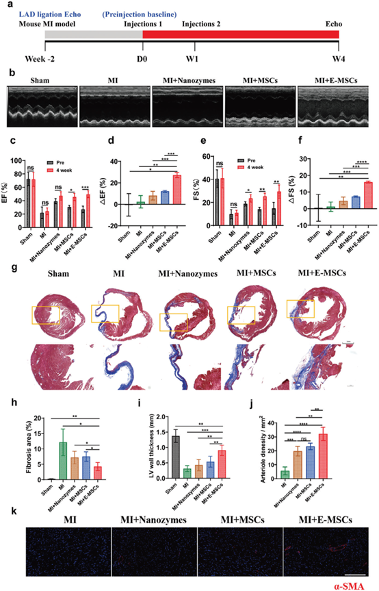 体外研究发现与MSCs相比,E-MSCs的干性、分化、迁移、抗氧化和抗炎等性能显著增强。体内示踪实验表明移植24小时内E-MSCs在心梗部位的MIR信号明显增强,治疗结果表明E-MSCs同时发挥了纳米酶的抗氧化和抗炎作用以及MSCs的再生和血管生成功能,从而降低心梗小鼠的心肌纤维化,增强心功能。