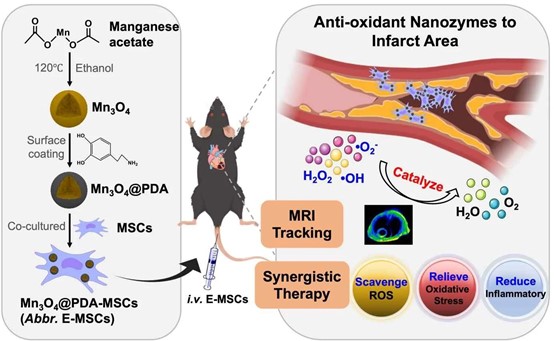 干细胞优良的旁分泌作用、免疫调节功能、抗炎性能虽然在心肌梗死(简称心梗)治疗中已初见成效,但仍然存在两个亟需解决的挑战:一是心梗部高活性氧(ROS)、高氧化应激、炎症等极端的微环境,导致干细胞的存活率和驻留率低而疗效有限;二是干细胞的体内分布、迁移和归巢不明确,阻碍其临床推广应用。