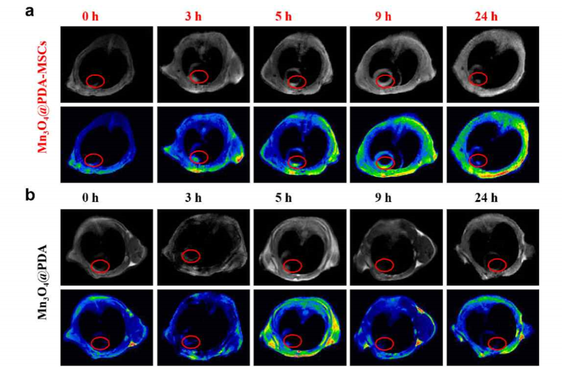 图2 Mn3O4@PDA-MSCs及Mn3O4@PDA在体内的MRI成像。