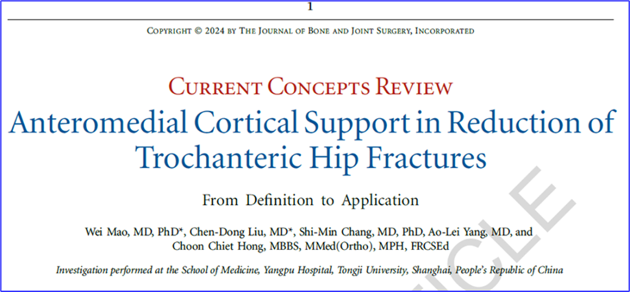 【文献出处】Mao W, Liu CD, Chang SM, Yang AL, Hong CC. Anteromedial Cortical Support in Reduction of Trochanteric Hip Fractures: From Definition to Application. J Bone Joint Surg Am. 2024 Apr 29. doi: 10.2106/JBJS.23.01023. Epub ahead of print. PMID: 38683886.