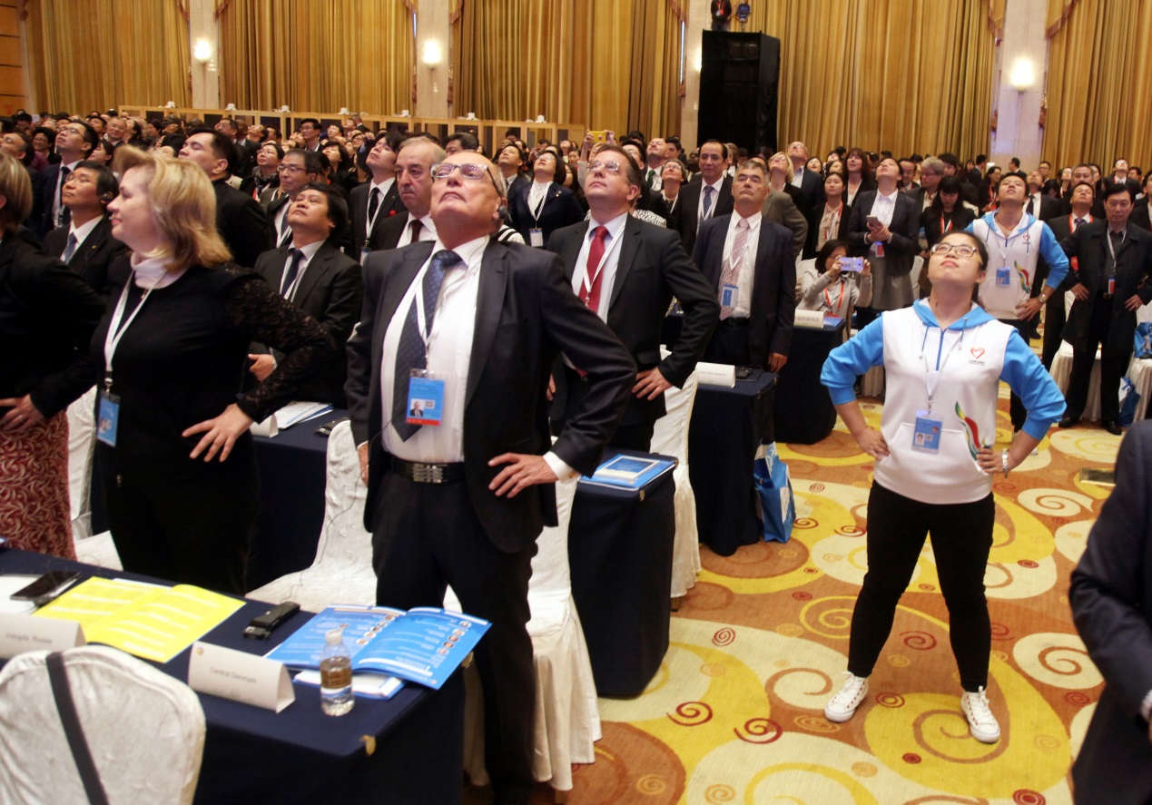 “上午的开幕式已经结束,接下来让我们跟着志愿者一起动动手,耸耸肩,让健康行为成为一种习惯。”动感的音乐响起,千余名中外嘉宾在小康康志愿者的带领下,纷纷起身站立,“动次打次”做起了健康操。这一幕成为了第九届全球健康促进大会上最“嗨”的一道风景线。