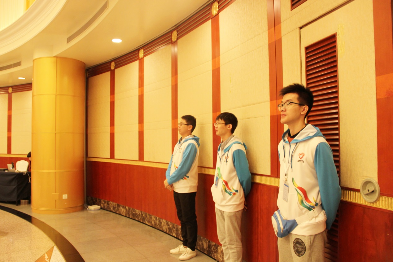 大会第二天,气温骤降,签到台的志愿者们在寒风中依然用最温暖的笑容迎接着每一位客人,当听到每一句“thank you”都是对志愿者们最大的鼓励。嘉宾们儒雅绅士的大家风范也感染着在场的每一个人,不停的互动和交流凸显了志愿者存在的价值。小康康们耐心认真的帮助每一位嘉宾解决问题实现他们的需求。会议厅大门旁的志愿者负责大门的开关和嘉宾的进出,为了保证会议厅有个安静的就会环境,必须在嘉宾进出时及时把门关启。会议厅的门口是纯木质的很沉,对于女生来说坚持一会手臂会很酸,但是“门神组”的女生志愿者们都坚持了下来,她们虽然没能进入内场和大家一起聆听来自世界的声音,但深知自己的使命,站好每一个岗,完成每一项任务,无论在哪都是为大会的顺利举行贡献一份力量。