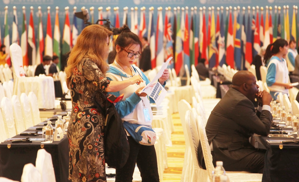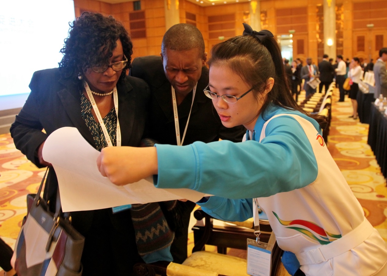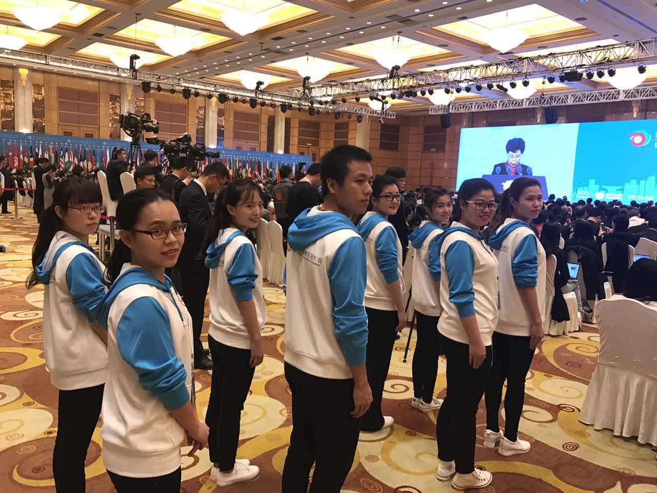 主会场气势磅礴,分论坛的志愿工作也十分精彩,负责欧洲厅分会场的志愿者们也遇到了一些突发状况:帮外国嘉宾找座位,找会场,布置场地,拿同传耳机,找电源转换器,寻找丢失的手机,帮助连接wifi,有的时候还要客串一下做翻译,会场里有一位外国参会代表,只能看懂法语看不懂英语,但是当时在会场里找不到会法语的人,一开始就用手比划意思,然后还和负责老师一边查词典一边把重点词语翻译给他看,最终顺利为这位外国友人解决问题,同学们纷纷感慨,在做志愿服务时语言不通并不完全是一种障碍,只要有心并且积极想办法解决,终会实现帮助他人的初衷,完成这些平凡却重要的小事。