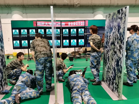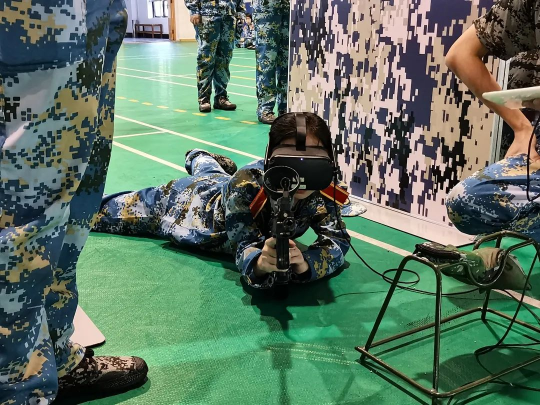 同学们在教官的带领下有序来到VR射击体验馆。很快,在随训教官调试好设备后,按组上前体验。
